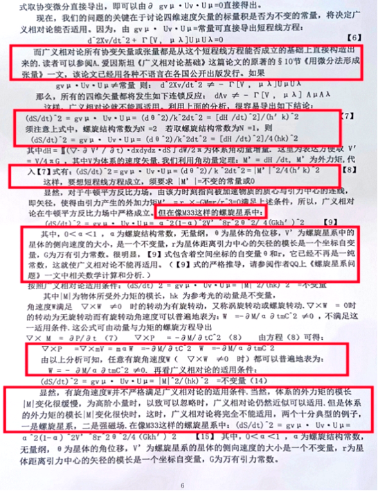 并且,通过力矩与动量的螺旋方程可以定量地计算出一般螺旋星系,如银河系,M33系等星系中存在不可忽略的“扰率”,存在“扰率”意味着星系圆盘将会被自然地螺旋化而扭曲成所谓的“翘曲”. 在牛顿平方反比力场中,如太阳系中,“扰率”很小,以致可以忽略.而“扰率”为0或可以忽略,这是建立广义相对论的数学基础----这一点,在很多介绍广义相对论的数学原理的书籍中都有说明和介绍.